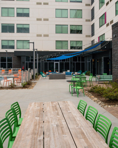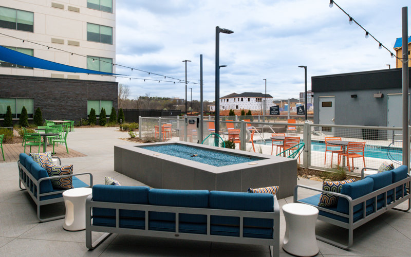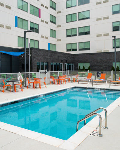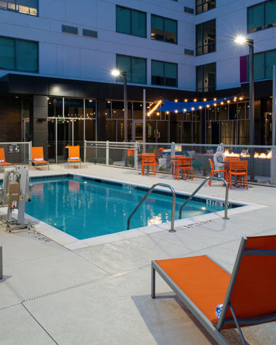 This 5-story, 63,598 SF, steel-framed hotel building consists of 139 guestrooms with various support functions. Public spaces on the ground floor include front desk service, five meeting rooms, a lounge with a wet bar, a fitness center, an outdoor patio area with a fire pit, a swimming pool, and a bath/shower house.