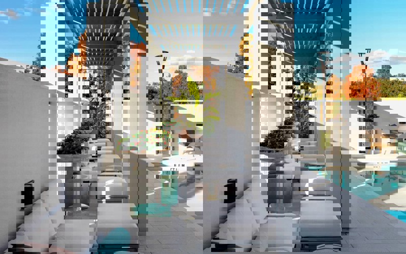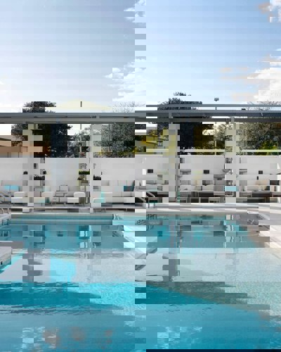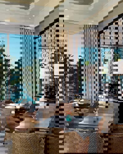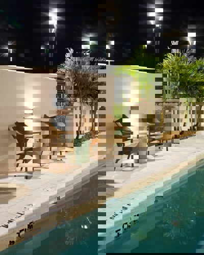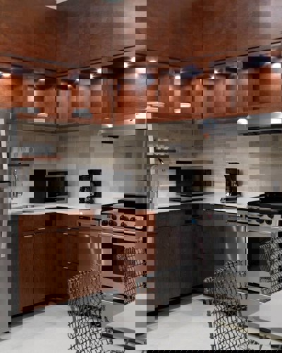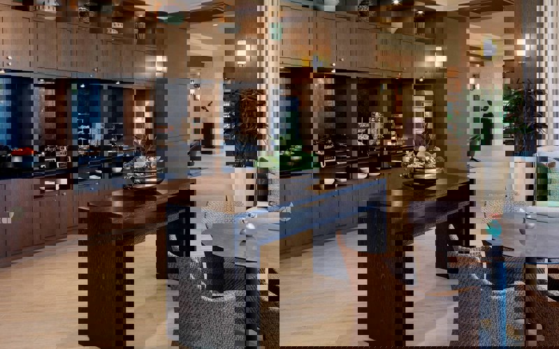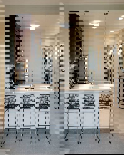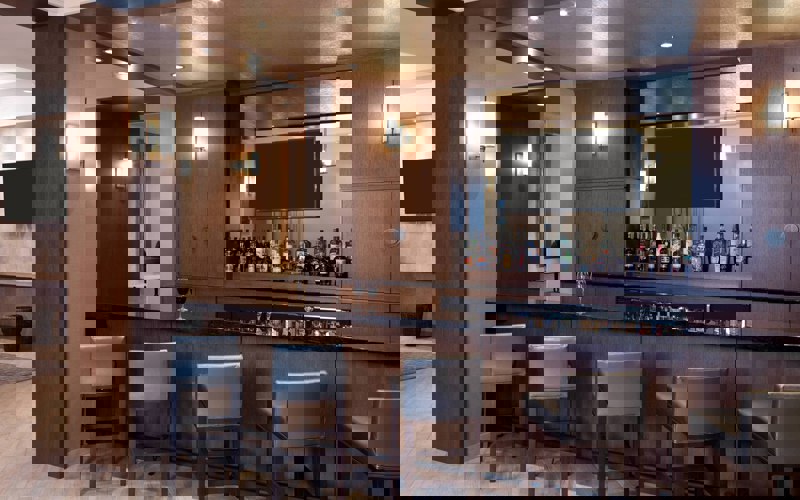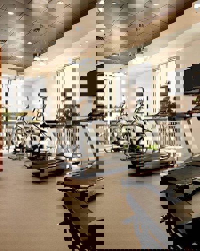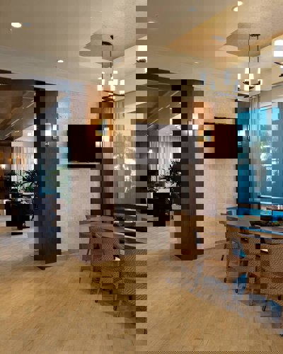 Public spaces on the ground floor feature custom finishes and include a guest lobby with lounges, a breakfast room with communal areas, a full service bar, food preparation areas, restrooms, a fitness center, and an outdoor swimming pool.