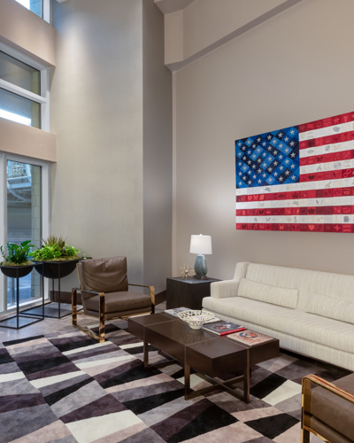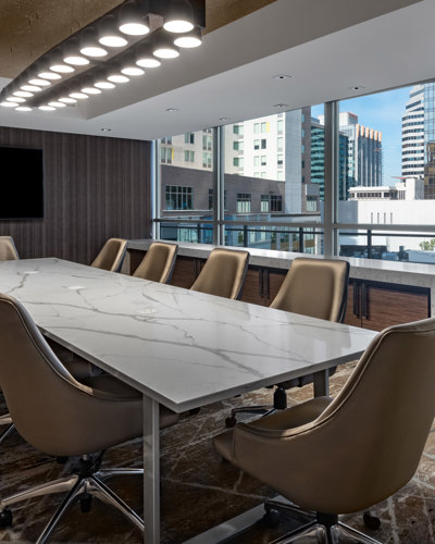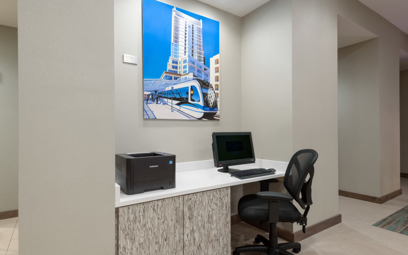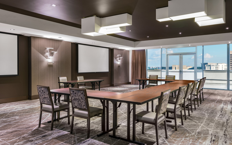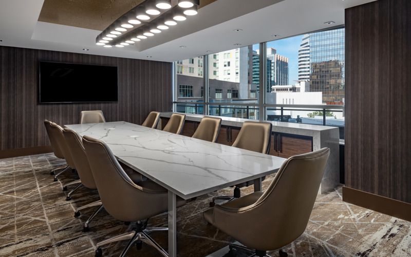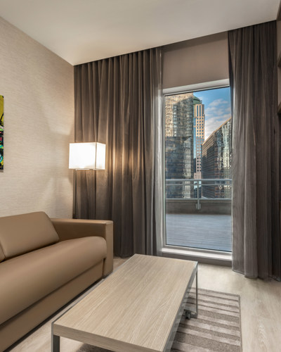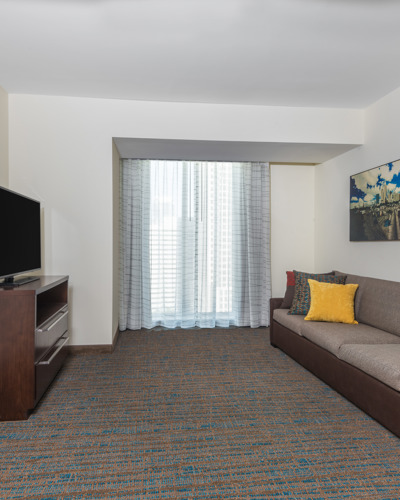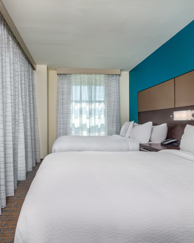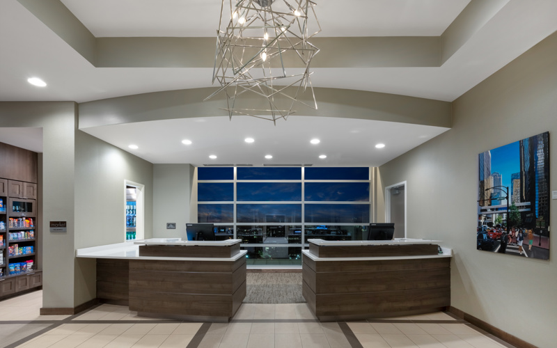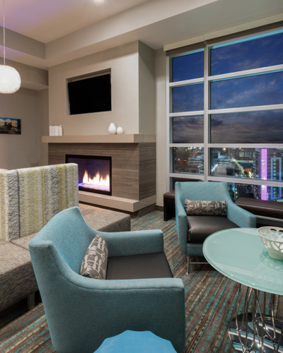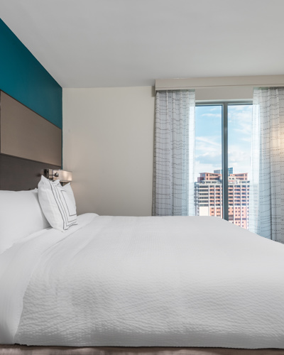 Levels 14-21 of the tower feature a Residence Inn with 116 apartment-style rooms with a mix of studios and one- and two-bedroom suites that include full kitchens. The Residence Inn lobby is located on level 14 and includes guest check-in, dining and food prep areas, and administration offices.