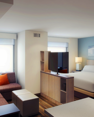 This hotel will offer 95,500 square feet of amenities, including a limited-service kitchen and an adjacent breakfast area, a porte cochere, and meeting and board rooms. There will also be an outdoor pool area, with gathering areas both inside and outside the fenced space.