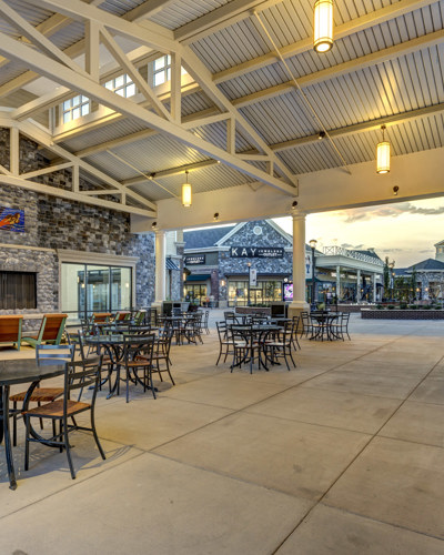The buildings were constructed of tilt-up concrete wall panels with structural steel, metal stud framing, and sheathing. The exterior façade finishes included anodized aluminum storefronts, thin bricks, synthetic wood siding, decorative glazing, and various soft- and hard-style awnings. The project also included a center-wide sound system and a total coverage WiFi system.