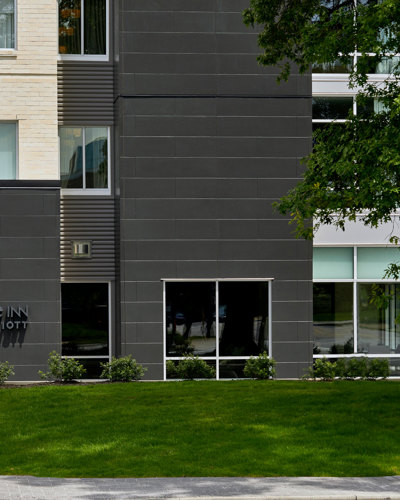 The new 175-room, 131,000 SF hotel was built with cast-in-place concrete foundations, a slab-on-grade structural steel podium, structural cold-formed metal framing and joists, a metal deck, a gypcrete topping, unit masonry, brick veneer, cultured marble, metal wall panels, fiber cement siding, millwork and manufactured casework, gypsum board assemblies, waterproofing and membrane air barriers, and TPO membrane and vegetative roof systems.