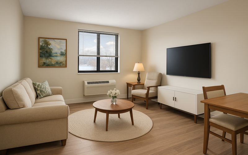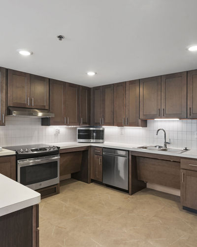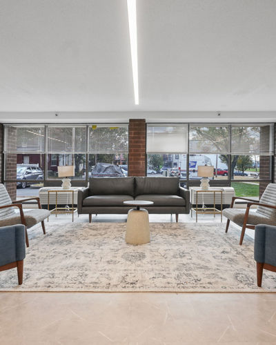 The interior renovation work included the installation of new finishes, casework, appliances, plumbing fixtures, and light fixtures. HVAC was upgraded to enhance the comfort and energy efficiency of the building. Doors and windows were replaced to improve functionality and aesthetics. Envelope work involved roof replacement and masonry restoration to enhance the building's durability and appearance. Site improvements included repaving, hardscape and landscape enhancements, and the addition of a pavilion, dumpster enclosure, and monument signs.