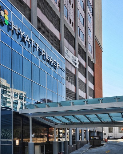 The building also includes a 172-room Hyatt Place Hotel with a multi-story hotel lobby area located on the 10th floor, an 8,000 SF rooftop restaurant, 2,600 SF of retail space on the ground floor, and 187 parking spaces located on floors 2 through 8.
