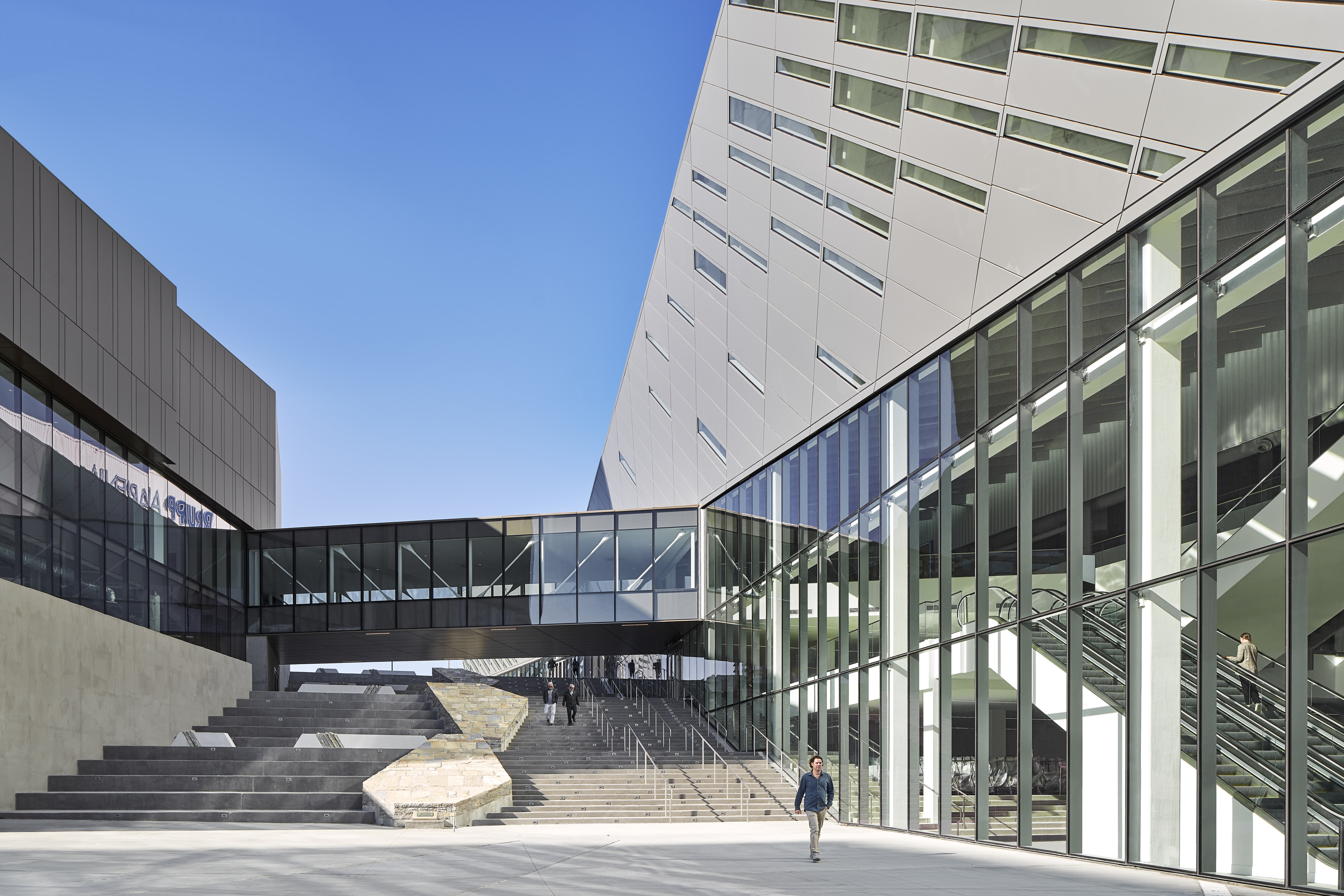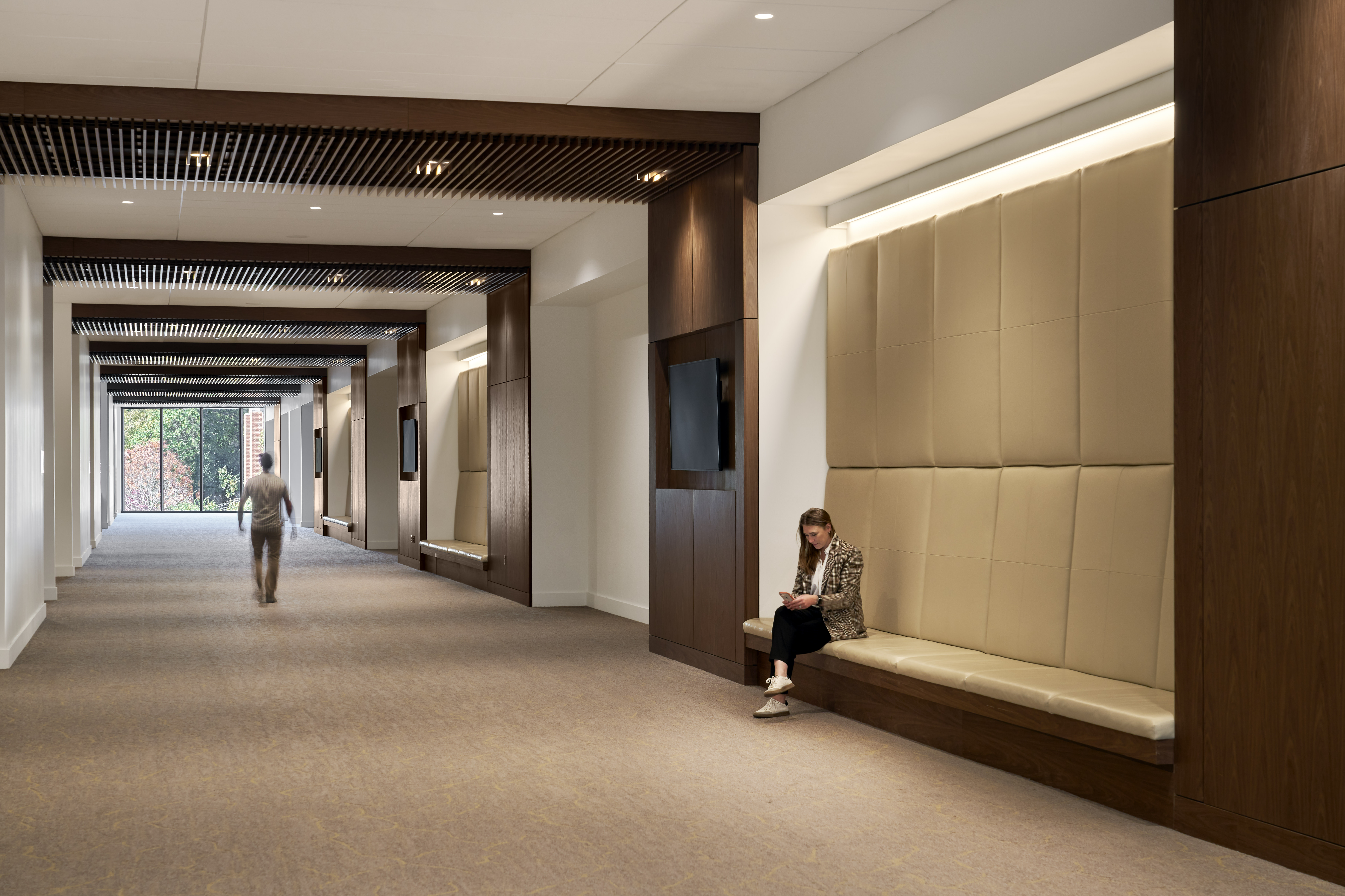 Cleveland Construction self-performed the installation of exterior trades, including glass fiber reinforced concrete panels, exterior cold-formed metal framing, exterior sheathing, exterior insulated finish systems, and weather barriers. The interior scope included metal stud framing and drywall, acoustical panel ceilings, metal panel ceilings, linear wood ceilings, suspended decorative wood grids, stretch fabric wall systems, and sound-absorbing ceiling baffles.