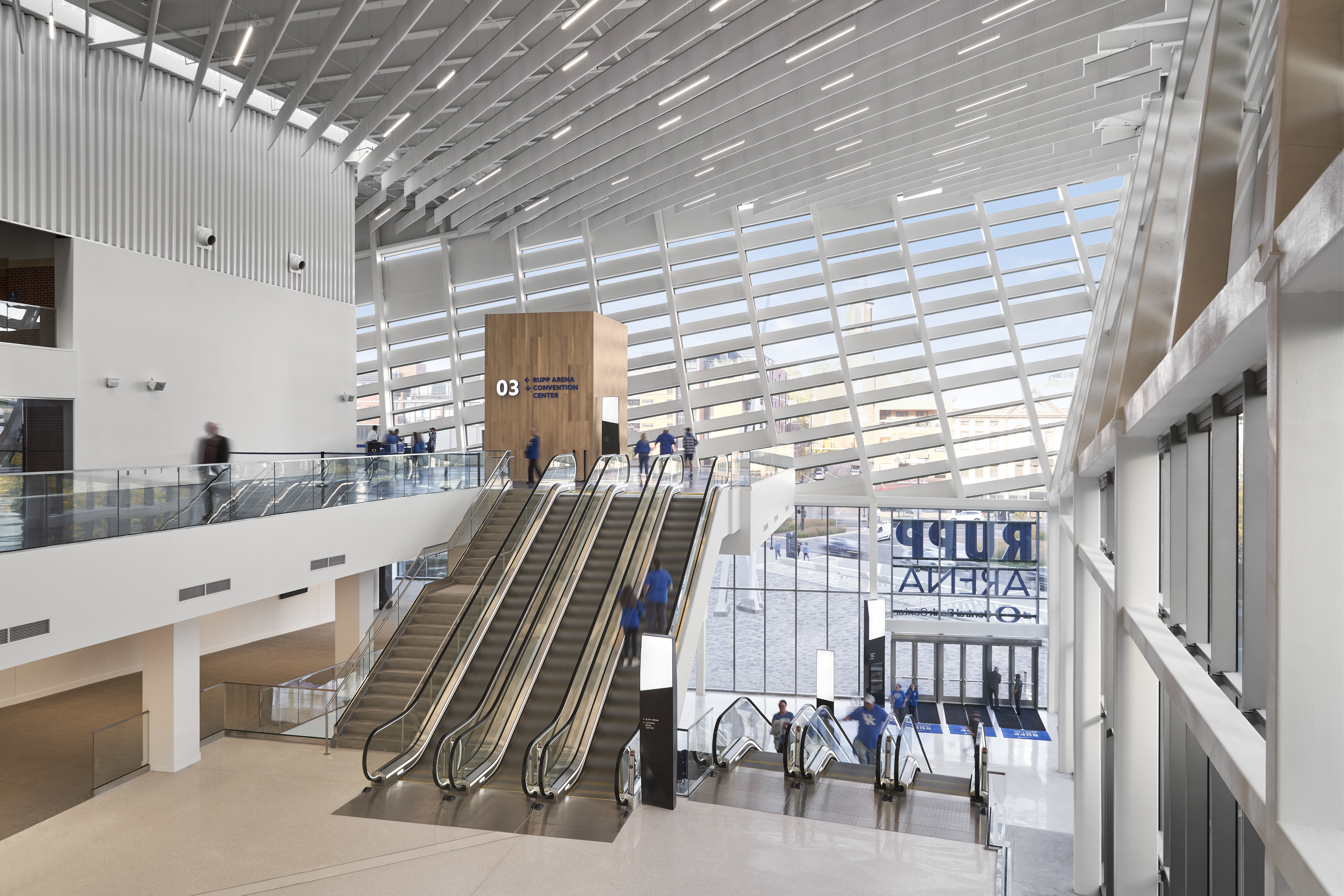Improvements to Rupp Arena included a 44,000 SF expansion of the main concourse to improve crowd circulation, new chair-back upper-level seating, a structural deck overlay to enhance sight-lines, and a new wedge-shaped metal and glass exterior façade around the expanded concourse.